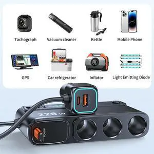 Telescopic Cable USB C Car Charger Adapter 228W Cigarette Lighter Splitter QC3.0 PD45W LED Voltage Display 12V/24V