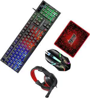 Wired Gaming Keyboard and Mouse Headset Combo,Rainbow LED Backlit Wired Keyboard,Over Ear Headphone with Mic,Rainbow Backlit Gaming Mice,Mouse Pad,for PC,Laptop,Mac,PS4,Xbox(Black)