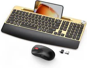GAMCATZ Wireless Keyboard and Mouse, Ergonomic with Wrist Rest, Phone/Tablet Holder,Windows & Mac OS,Full-Size Quiet Keyboard Mouse Compatible for Laptop,PC, Mac, Windows -Glod Black