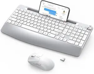 GAMCATZ Ergonomic Wireless Keyboard and Mouse, Full Size Wireless Keyboard Designed with Phone Holder and Wrist Rest,Volume Roller for Computer Mac PC Laptop-White