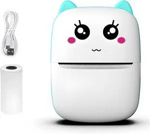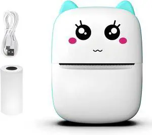 Inkless Printer, Student Mobile Error Printing Tool, Cat Design Compact Wireless Printer, USB Wire and Roll of Thermal Paper, Sky Blue Includes