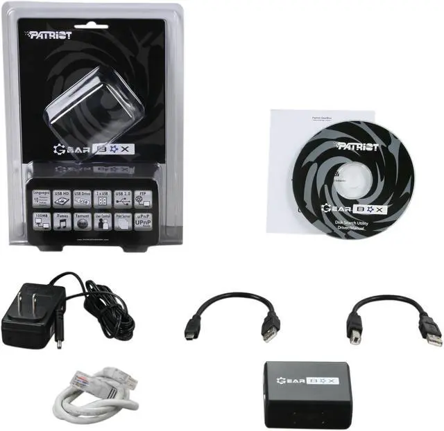 | Features | Support for USB 2.0 flash Support for USB 2.0 External storage Print server functionality 10/100Mbps Fast Ethernet P2P Torrent support UPnP support FTP support Itune Server feature The Patriot GearBox NAS adapter is a simple and cost effective solution for adding any USB storage device to your home network. GearBox easily connects to your LAN allowing users to share and access connected USB storage devices. GearBox offers a media server for UPNP capable devices such as Xbox360 and PlayStation 3, iTunes Server, a print server, P2P, FTP, email notifications and remote User Management. GearBox is compatible with Windows Mac and Linux. Two USB 2.0 ports and a fast Ethernet 10/100Mbps connection make GearBox the best way to utilize USB storage devices and enable sharing media and files across your network. |