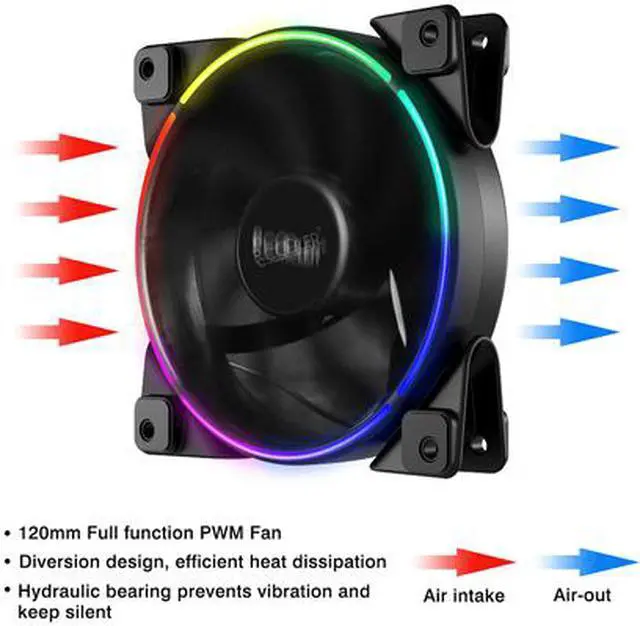 ? Intelligent Speed Control? 5 pcs 120mm full function PWM fans. The intelligent temperature controls the speed at 1000~1800±10% RPM, so the fan speed can be controlled and keep the fans quiet. Please connect the fan 4Pin PWM connector with 1-to-5 strip cable’s female port, do not connect it with motherboard. There’s switch fan speed control by motherboard’s PWM signal. These fans are 4pin 5v ARGB connector that connect with RGB control box one by one.? Dual Light Loop Design - Controlled by RGB Remote Controller? Addressable RGB LEDs can be controlled by RGB remote controller - 12 lighting modes, 8 different colors and multiple RGB light speeds, provide colorful streamer lighting effects.