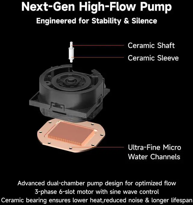 • Advanced OC PLUS V1.0 Pump Structure: Features a durable ceramic shaft and sleeve with ultra-precision micro channels for superior heat dissipation and low noise.