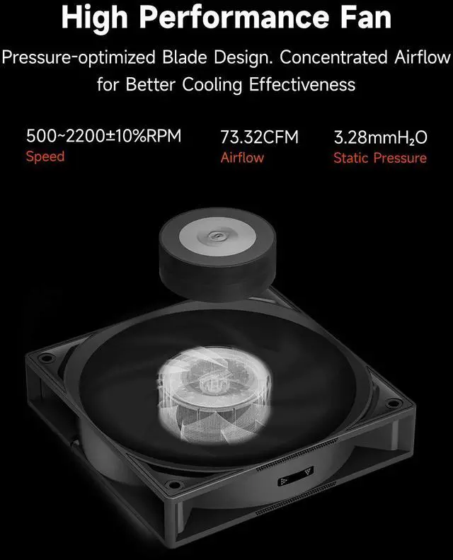 120mm PWM Fan --- Comes with a high-performance 120mm PWM fan, adjustable from 5002200 RPM. Offers strong airflow (up to 73.32 CFM) with low noise (34.9 dBA Max).