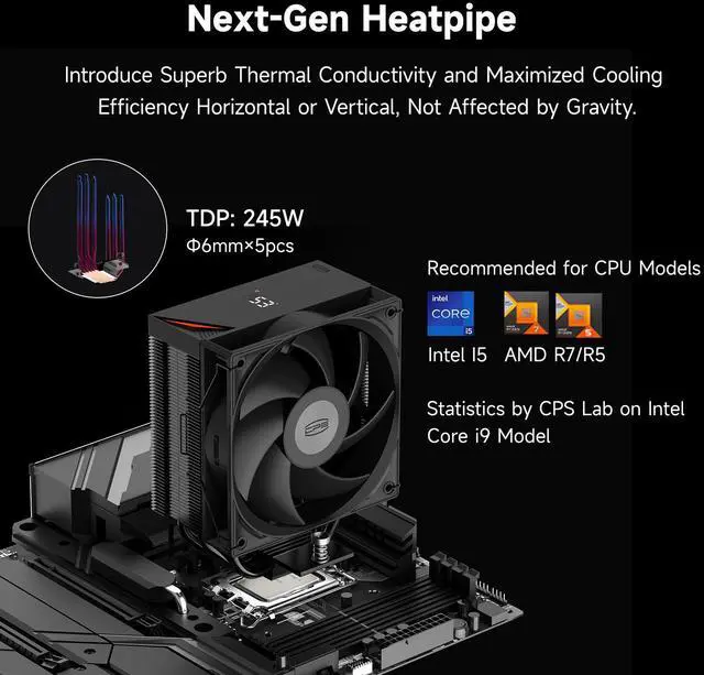 Efficient Heat Dissipation --- Features 5×6mm direct-contact copper heat pipes, delivering fast heat transfer and excellent cooling performance for CPUs up to 245W TDP.
