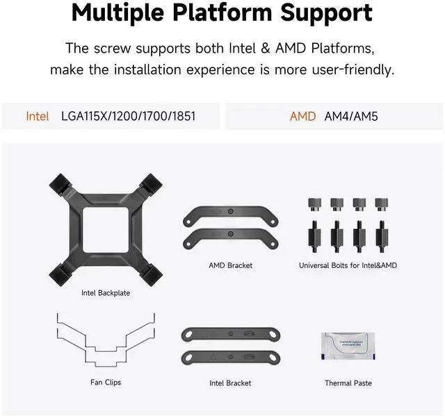 Wide Compatibility --- Compatible with Intel LGA1851/1700/1200/115X and AMD AM4/AM5 platforms, with a user-friendly mounting system for easy setup.