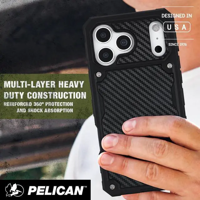 Your next adventure awaits - The Pelican Shield Series case protects your iPhone 17 Pro Max (6.9 inch), features dual-layer impact protection that keeps your phone safe, durable carbon fiber, and textured sides to enhance your grip. Whether you accidentally drop your phone while searching for your keys or forget it on top of your car, your iPhone will remain safe and fully operational. The shock-absorbing interior shell and reinforced corners work together to provide top-notch 24ft drop protection, exceeding military testing standards. The iPhone 17 Pro Max case also includes an easy-to-use 360-degree belt clip holster and a kickstand for added convenience. Carry your phone with the belt clip or use it as a phone stand to take calls and check directions when on the job. The built-in powerful magnet seamlessly syncs with all MagSafe chargers and accessories without influencing any type of phone signal. Precise laser cut-outs fit flawlessly with your iPhone, allowing full access to all functions.