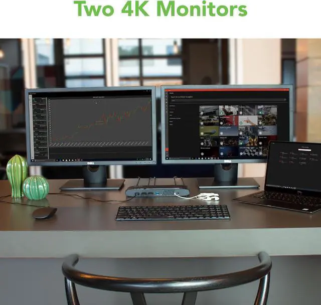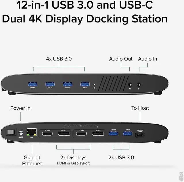 Featuring the latest DisplayLink DL-6950 chipset, the Plugable UD-6950H DisplayLink docking station lets you connect two external monitors up to a 4K@60Hz resolution using DisplayPort or HDMI to your Windows laptop, or desktop via USB 3.0. Can act as a HDMI splitter for dual monitors. Additionally, the USB 3 docking station allows you to connect up to eight accessories to the six USB 3.0 ports, a Gigabit Etherent connection and audio input/output ports all through a single USB cable.