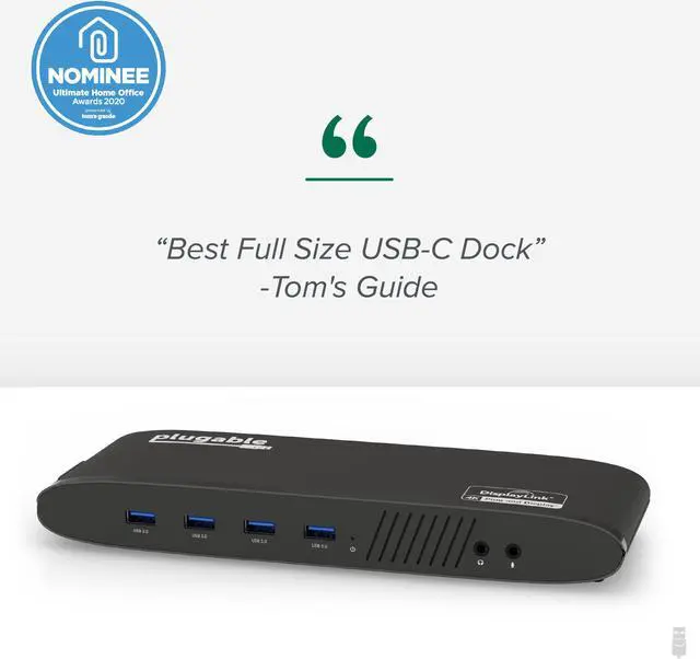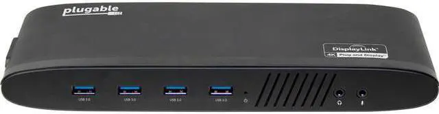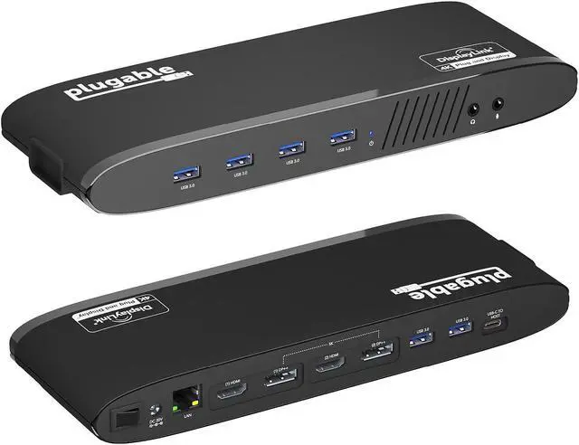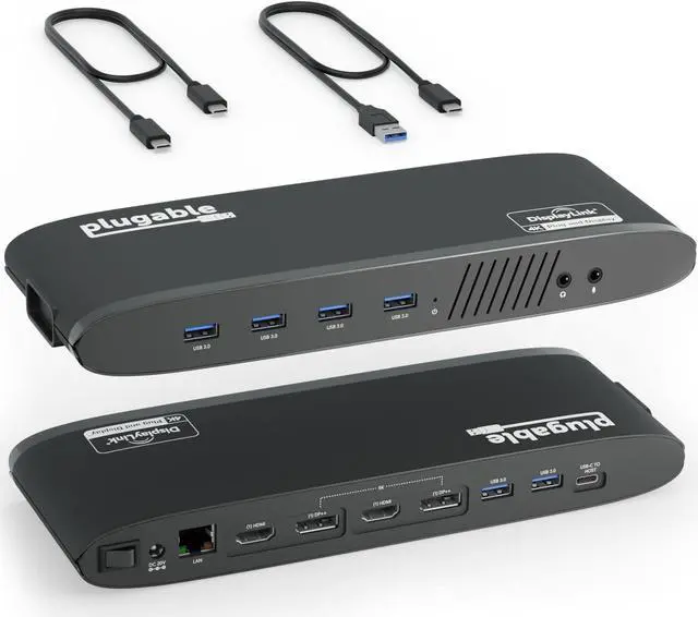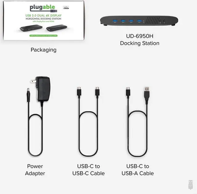 Plugable USB 3.0 Dual 4K Display Horizontal Docking Station, USB 3.0 Type-A to Type-C Cable, USB 3.1 Type-C to Type-C Cable, Power Adapter (US AC Wall Outlet Plug, 20V@2A), Quick Installation Guide