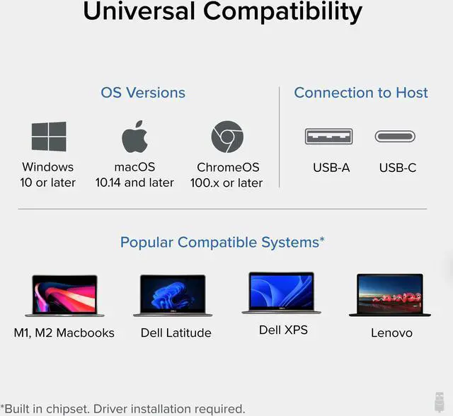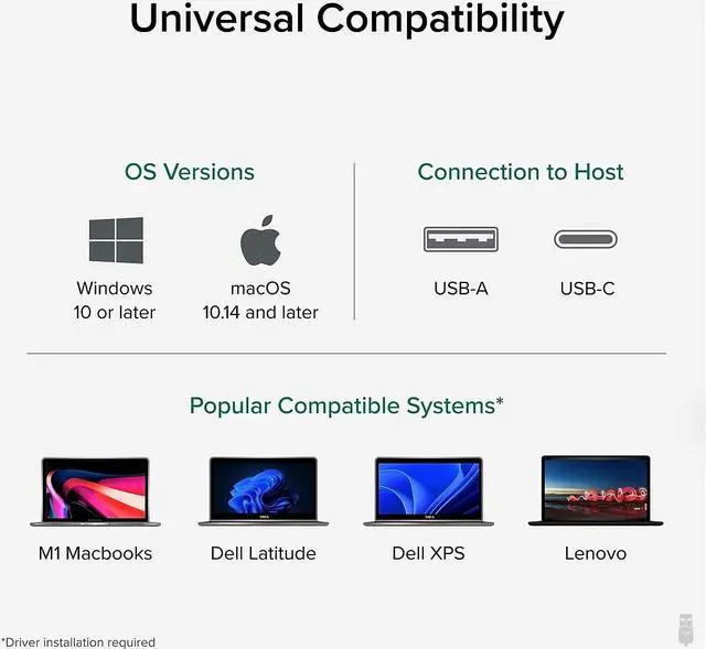 Our USB dock is compatible with most modern laptops and desktops running Windows 11, 10, 8.1 and 7 or macOS 10.14 + and requires the DisplayLink graphics software to be installed.