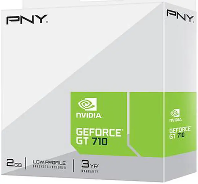 GeForce GT 710 2GB Low Profile PCIE DDR3 DVI-D, HDMI, VGA. Make your entire PC experience faster with the NVIDIA GeForce GT 710 by PNY dedicated graphics card. Now, you can enjoy up to 10x better performance than integrated graphics in all your PC multimedia applications. Take on modern games with advanced and reliable dedicated graphics. 80% faster performance than integrated graphics means a rich and smooth gaming experience. Plus, get the power to drive up to three HD displays with a single card.
