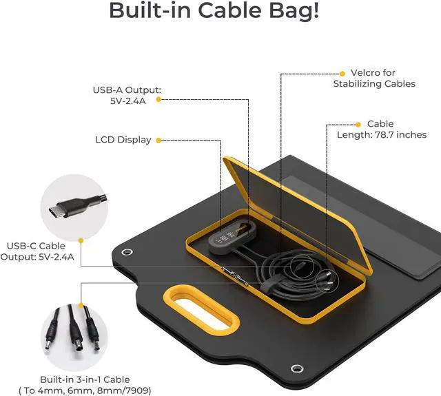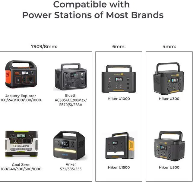 Powerness 120 watt Solar Panel with Multiple ConnectorsThe Powerness SolarX S120 is a 120 watt foldable and portbale solar panel that supports 3 methods of output: USB-A output, USB-C output (with the built-in USB-C cable), and DC output (with the built-in 3-in-1 cable). The 3 in 1 cable has 3 connectors, the 4mm, 6mm, and 8mm/7909, making it compatible with most common power stations/solar generators on the market such as Jackery, EF ECOFLOW, and BLUETTI, Anker, Goal Zero, etc.