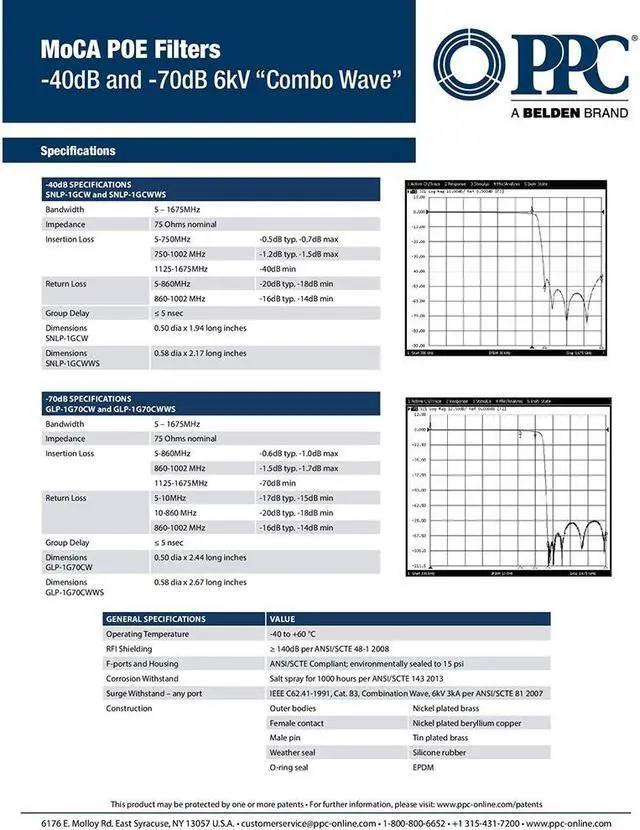 The BELDEN PPC MoCA "Point of Entry" filter Model SNLP-1GCW serves as in-home networking services pass through for the 5-1002MHz band while providing an excellent termination for the MoCA band from 860Mhz to 1525MHZ. The device physically isolates the subscriber premise by providing a band stop at the networks Point of entry "POE" This avoids interference from other MoCA users. The device provides a perfect termination for the MoCA band and reduces micro reflections that would typically reduce the data throughput.