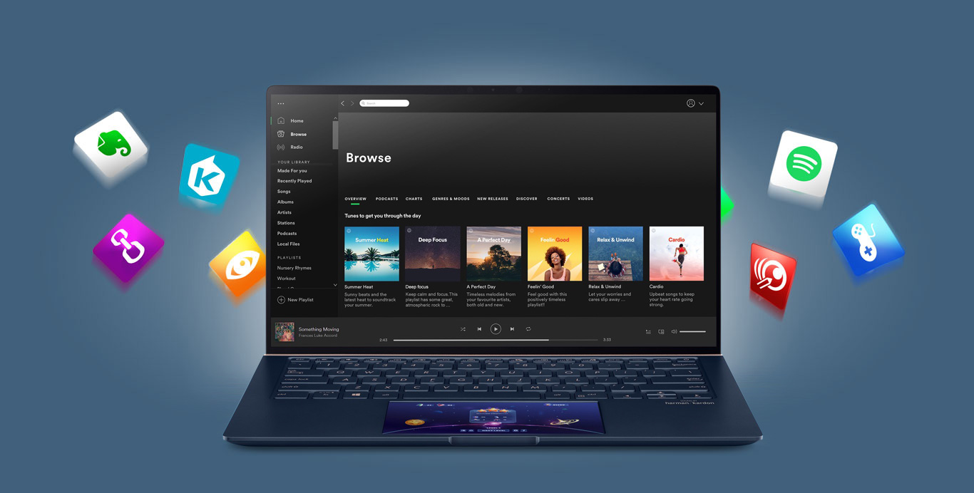 ScreenPad 2.0 intelligently fits many apps into the 5.65-inch touchscreen, and you can effortlessly add apps to ScreenPad for instant access. The newly-optimized ScreenPad experience ensures that your favorite apps, such as Evernote and Spotify, will work perfectly on the secondary display right away. ASUS also works closely with third party developers, including video-editing software developer Corel, to optimize adaptive ScreenPad tools for ultimate productivity – and there's much more to come. Get ready for the ScreenPad revolution!