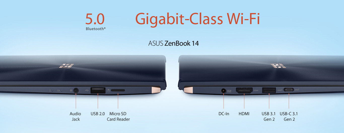 A comprehensive set of high-performance I/O ports gives ZenBook 14 ultimate, hassle-free connectivity for versatile flexibility whether you're in the office or on the road. And the integrated gigabit-class Wi-Fi lets you enjoy ultrafast downloads and smooth streaming with greater range and more stable network connections than ever before.