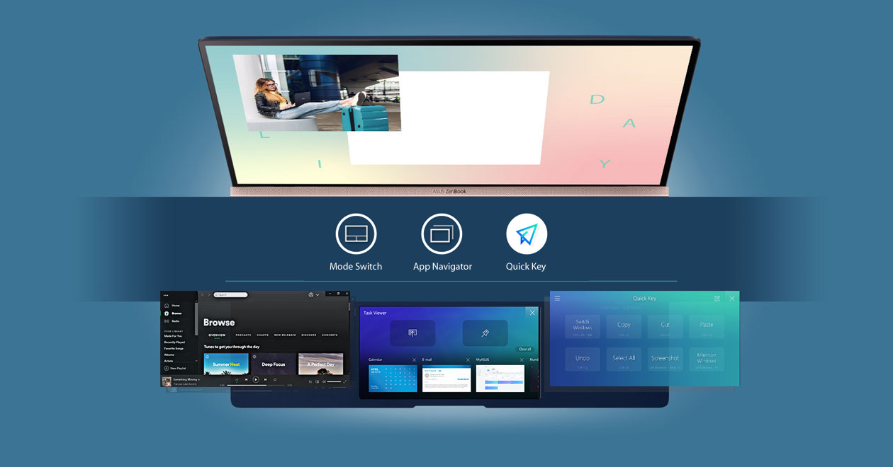 Tap the Mode Switch icon to switch between ScreenPad control and touchpad functions. Tap the App Navigator to view all open apps and move an app or window in between two displays. Simplify Quick Key sequences into a single touch, to give you personalized hotkeys for your most-used tasks.