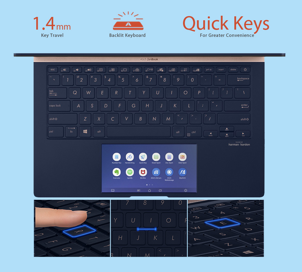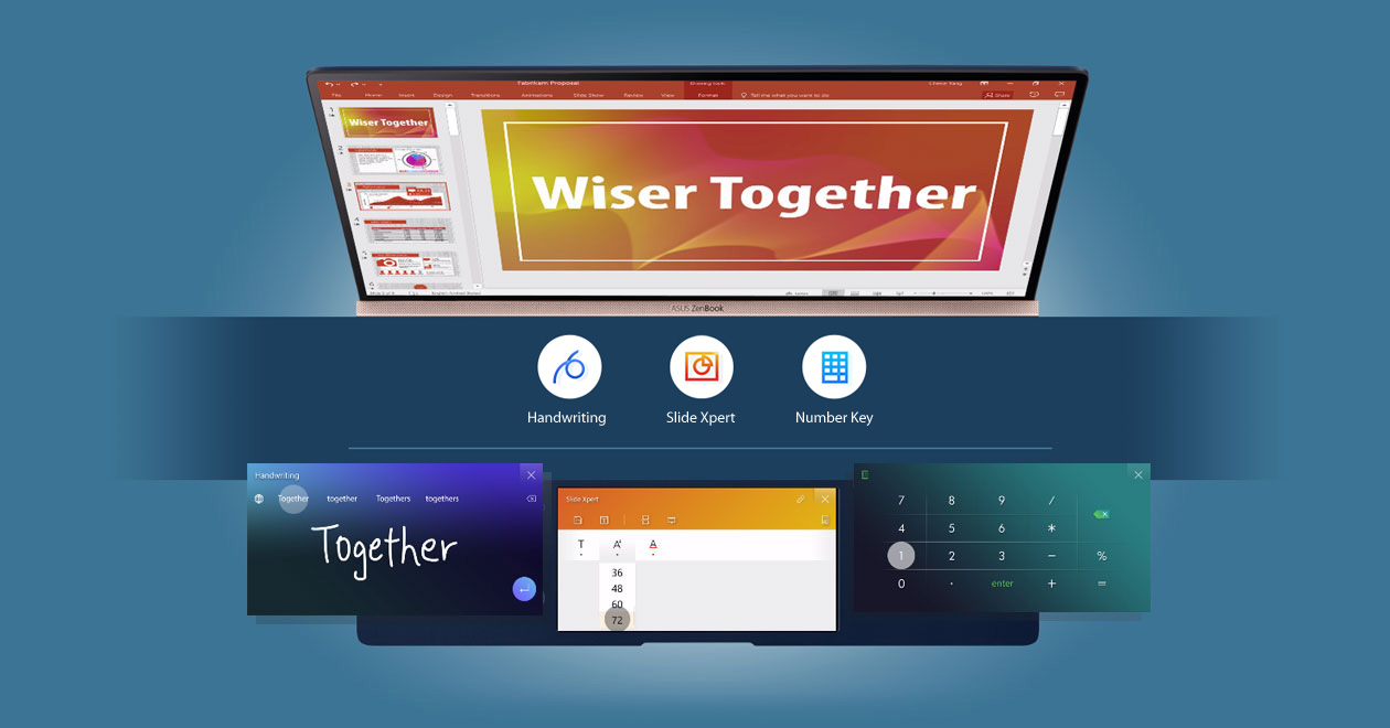 With Handwriting, ScreenPad 2.0 allows you to take notes and record your thoughts or ideas easily. Slide Xpert lets you get instant fingertip control of common functions when you're editing PowerPoint, Excel, or Word documents to make tasks easier. Number Key is an easy and intuitive way to enter numeric data.