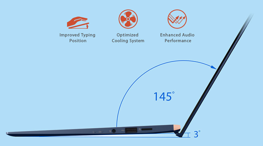 With any ZenBook, your comfort is one of our top priorities. ZenBook 14 goes the extra mile with its exclusive ErgoLift hinge, an engineering masterpiece designed to automatically tilt the keyboard to the most comfortable typing position. But that's not all: the carefully calculated tilt improves cooling and audio performance too.