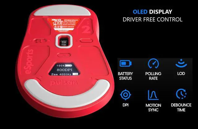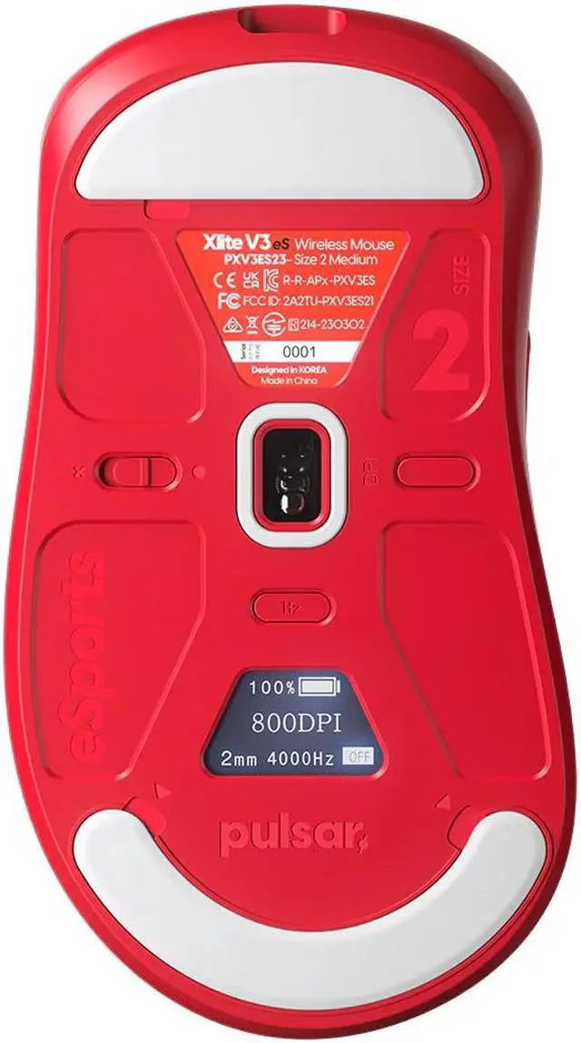 Pulsar Gaming Gears Xlite V3 Medium eS Wireless Gaming Mouse Lightweight 65g Ergonomic Right Hand, 2.4 Ghz 4K Dongle included PAW3395 26K DPI Optical Sensor, OLED display, Red