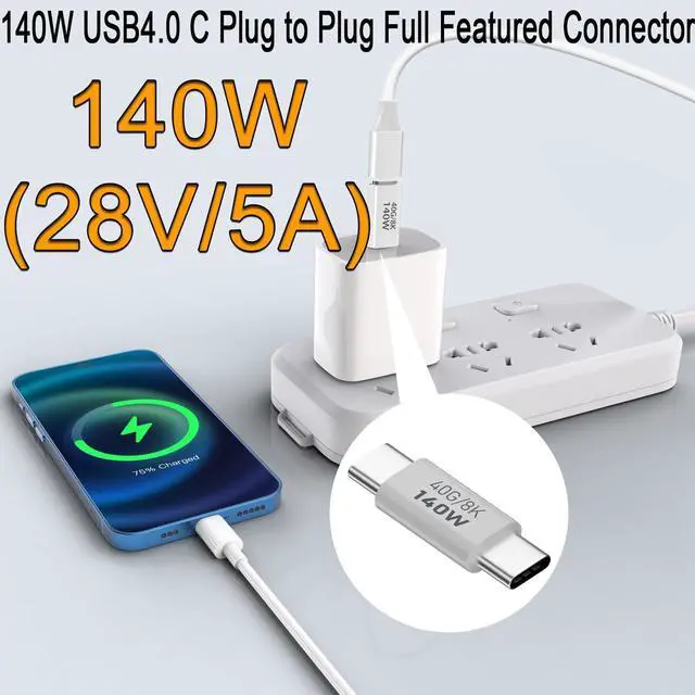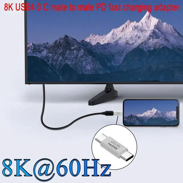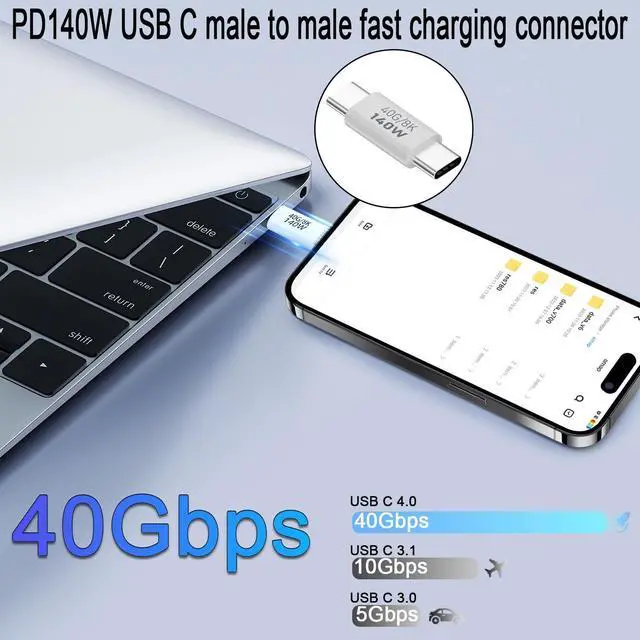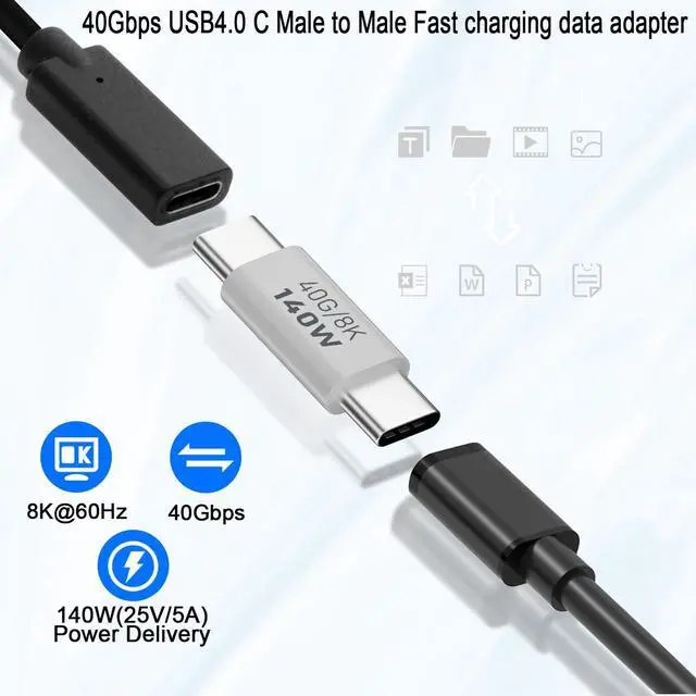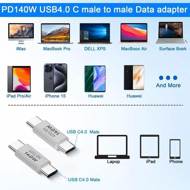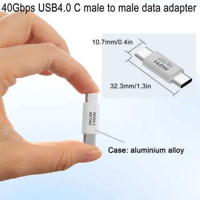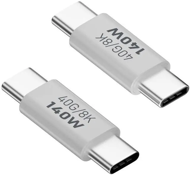 PD 140W 40Gbps USB4.0 Type C male to male connector. Plug and play, compact and portable, more space-saving than USB C cable. Proximity connection, more stable charging or data transmission without delay. Suitable for PD fast charging, data transfer, headset, video calling, screen casting, OTG, Suitable for mobile phone,tablet,game console,U disk and other devices with Type C interface, plug and play. Aluminium alloy shell, sturdy and durable, easy to dissipate heat. White baking paint, exquisite and beautiful.