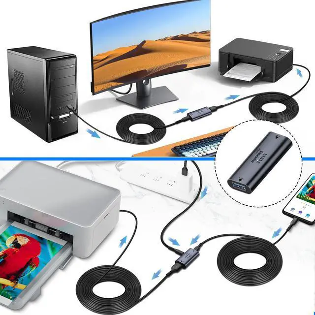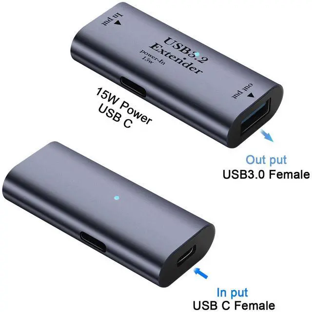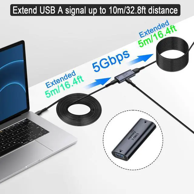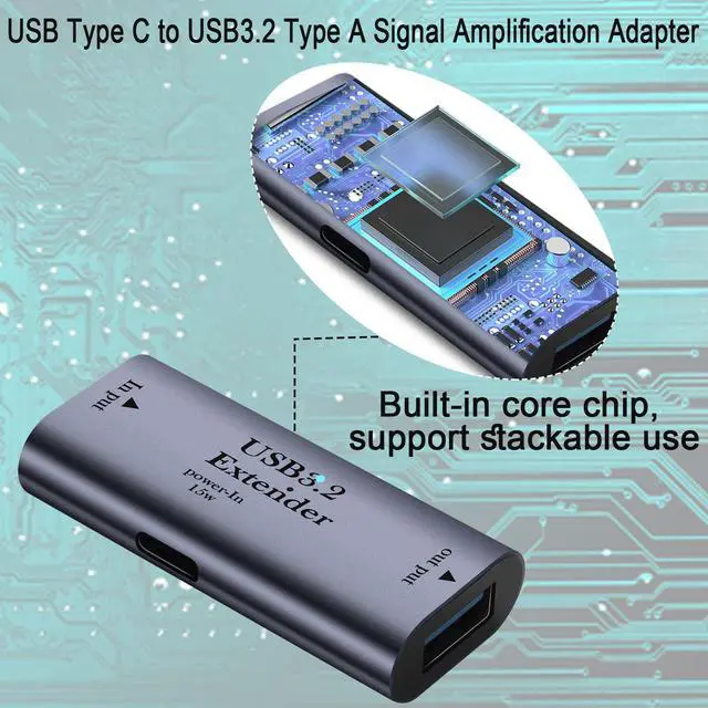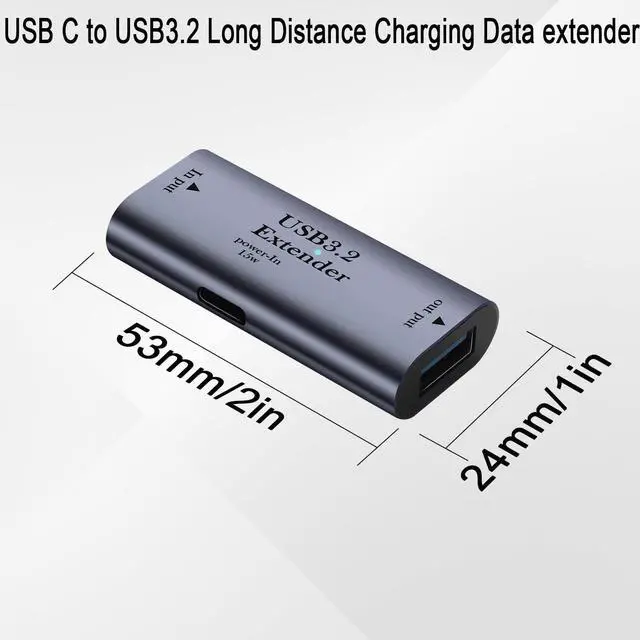 5Gbps USB C to USB3.2 Long Distance Signal Amplification Extender adapter, USB C input, USB3.2 output, for long distance conversion to extend USB3.2 signals. Maximum extendable distance is 10m/32.8ft.Built-in core chip, stackable, each additional extender can extend 5m/16.4ft more.Aluminium alloy shell, durable and easy to dissipate heat.LED indicator, light up when external power supply. Used for USB3.2 signal long distance work or transmission for computer, touch screen, printer, surveillance camera, scanner, code scanner gun, keyboard, mouse, gamepad and other devices.