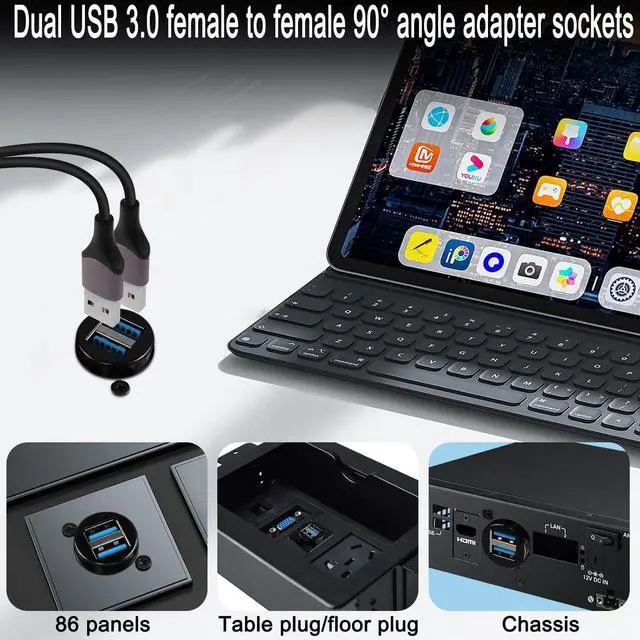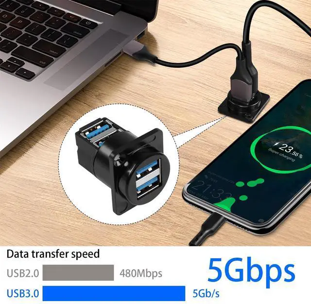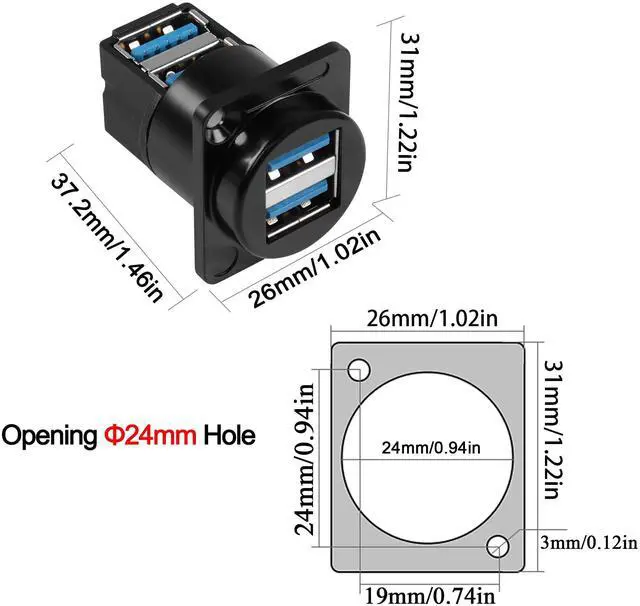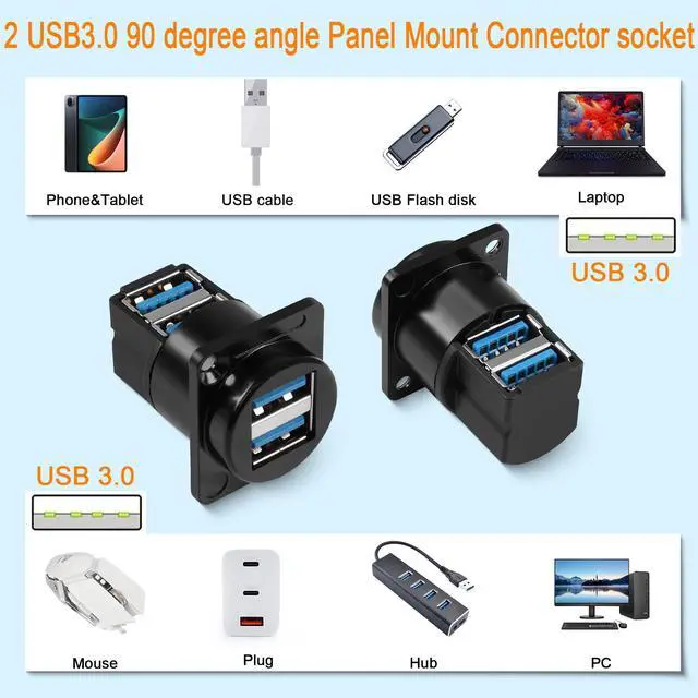 Dual USB 3.0 female to female connectors Panel Mount 90 degree angle adapter. 2 USB 3.0 port inputs and outputs for simultaneous data transfer or charging of 2 USB 3.0 devices without interfering with each other. 90 degree angled design allows the cable to fit snugly into the adapter for easy cabling in tight spaces. Standard XLR panel / D-panel mounting size, suitable for mounting on desktops, walls, and equipment panels. It is a reinforced and easy to install USB connection system for certain harsh conditions.