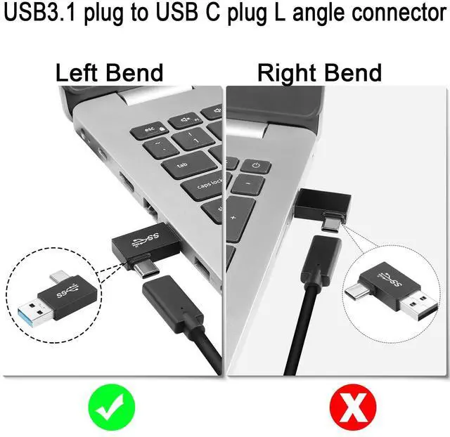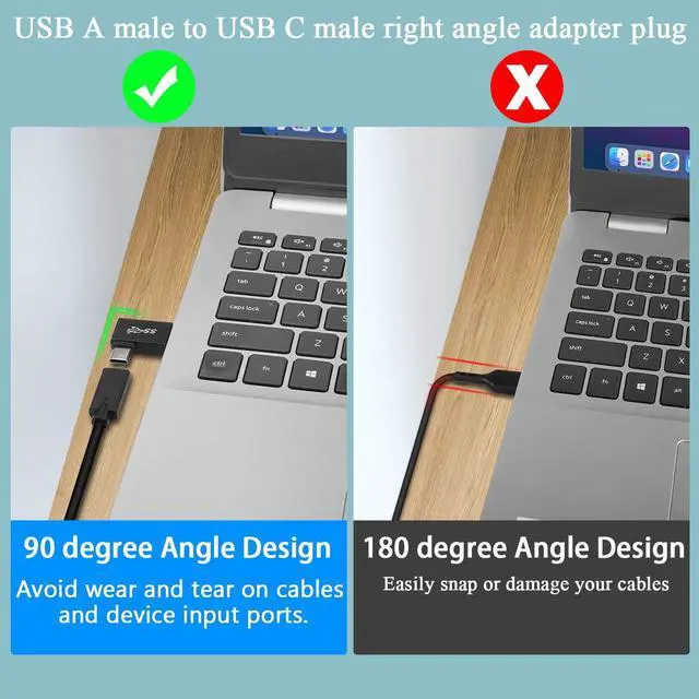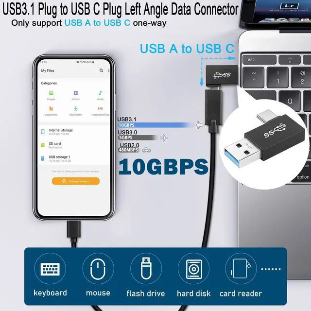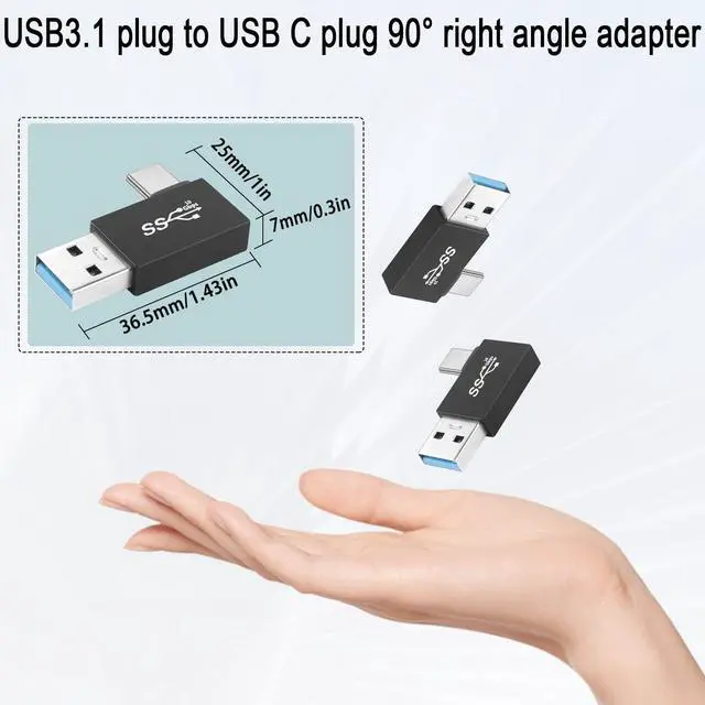 USB 3.1 male to USB C male 90° angle converter plug, convert device USB port output to USB C output for Wall charger, cell phone, PC, laptop, Power Bank. data transfer rate up to 10Gbps, support QC60W/PD15W fast charging. 90 degree right angle design to keep the alignment close to your device to avoid damage due to bending and extend the life of the cable. USB3.1 plug to USB C plug L-angle converter, delicate and compact, does not take up space, can be left in the USB port without causing interference, avoiding wear and tear on the interface of the device due to repeated unplugging. Aluminum alloy casing, sturdy and durable. Easier to dissipate heat than the usual plastic casing. Note: Only supports USB A to USB C one-way.