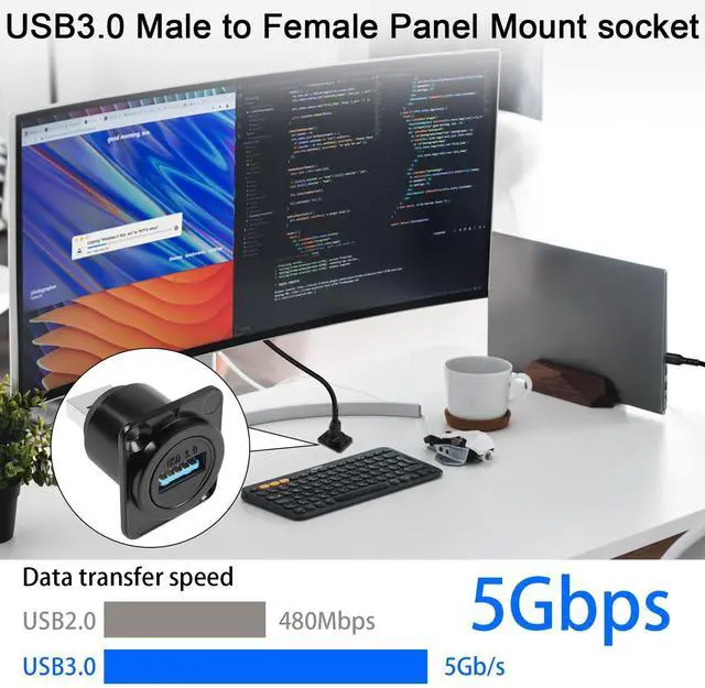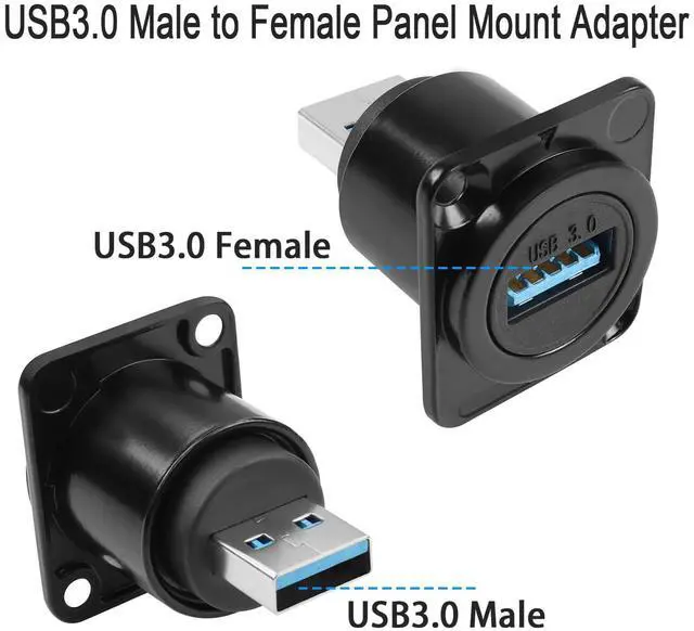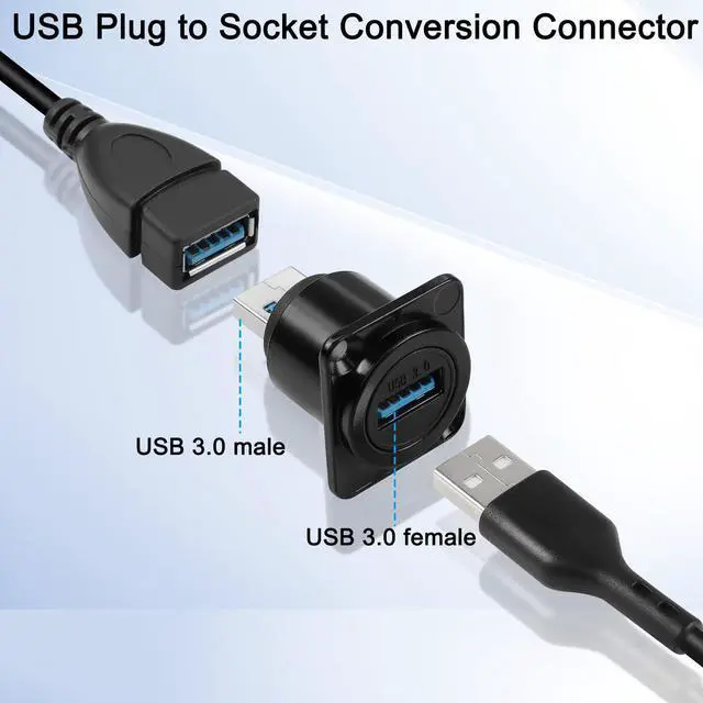 Converts USB3.0 male to USB3.0 female input and output, providing a stable data transfer and charging environment. Designed according to XLR panel / D-panel mounting dimensions (19mm*24mm), suitable for mounting in racks, cabinets, equipment panels, desktops, walls, floor plugs. Suitable for data transfer or charging between USB devices for computers, home, office, automation, medical, smart home, etc. It is a reinforced and easy to install USB connection system with a zinc alloy casing, robust and durable for use in certain harsh environments.