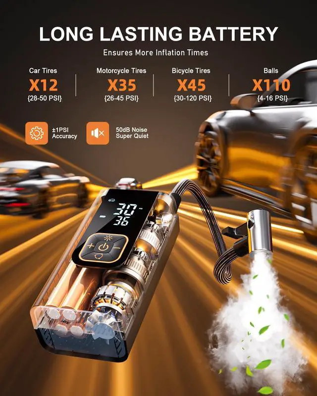 - Please fully charge the device before first use.• Clean the tire valve before connecting the hose.