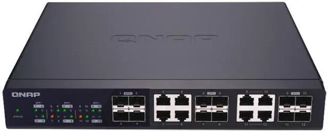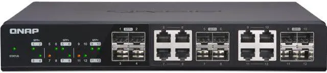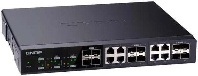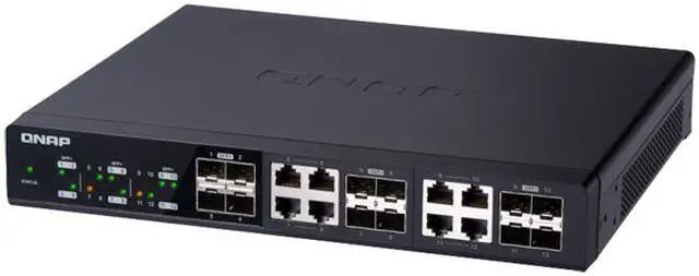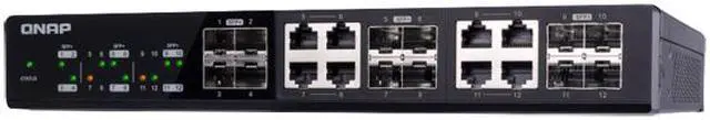 QNAP QSW-1208-8C 12-Port Unmanaged 10GbE Switch. Twelve 10GbE SFP+ Ports with Shared Eight 10GBASE-T Ports. Twelve 10GbE SFP+ ports with shared eight 10GBASE-T ports unmanaged switch, NBASE-T support for 5-speed auto negotiation (10G/5G/2.5G/1G/100M)