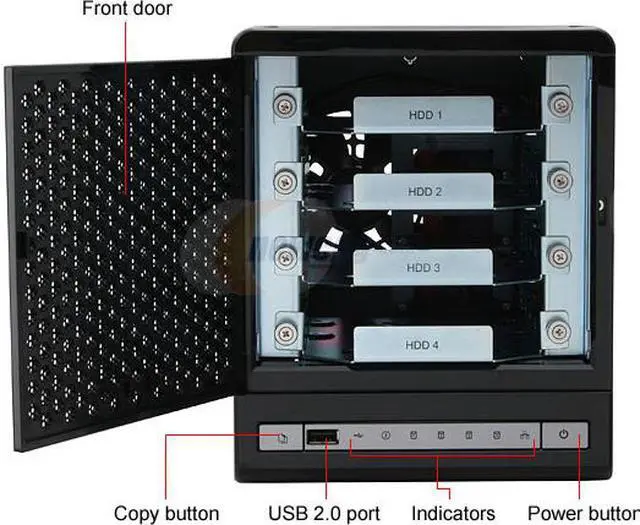 | LEDs | Status, USB, LAN, HDD 1, HDD 2, HDD 3, HDD 4 |