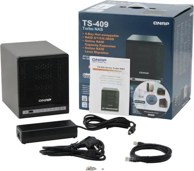 | Package Contents | TS-409 Power Adapter Power cord RJ45 Cable Screws |