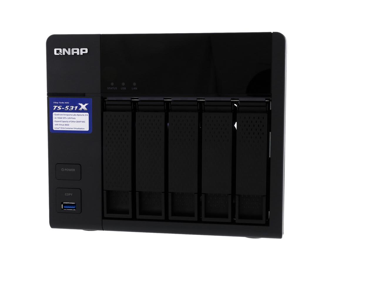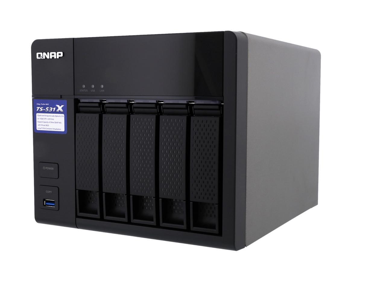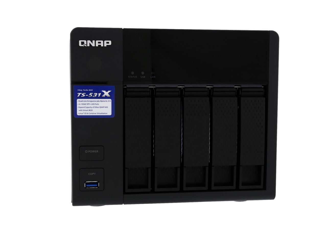 | Features | 10GbE readiness, SSD cache, and hardware-accelerated encryption engine VJBOD allows using the TS-531X to expand the storage capacity of other QNAP NAS Enjoy containerized virtualization and IoT app development with Container Station Build a private cloud to centrally organize & manage files and backup tasks Secure access with VPN Server & VPN Client Quickly find files using a real-time, natural search with Qsirch Centrally manage multiple email accounts with QmailAgent Easily manage contact information on your NAS with Qcontactz Expand the storage capacity to 21 drives by using QNAP expansion enclosures |