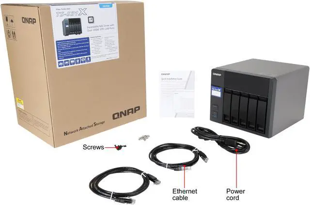 | Package Contents | TS-531X 2 x Ethernet Cable Power Cord 20 x Flat head screw (for 3.5" HDD) 15 x Flat head screw (for 2.5" HDD) Quick Installation Guide (QIG) |