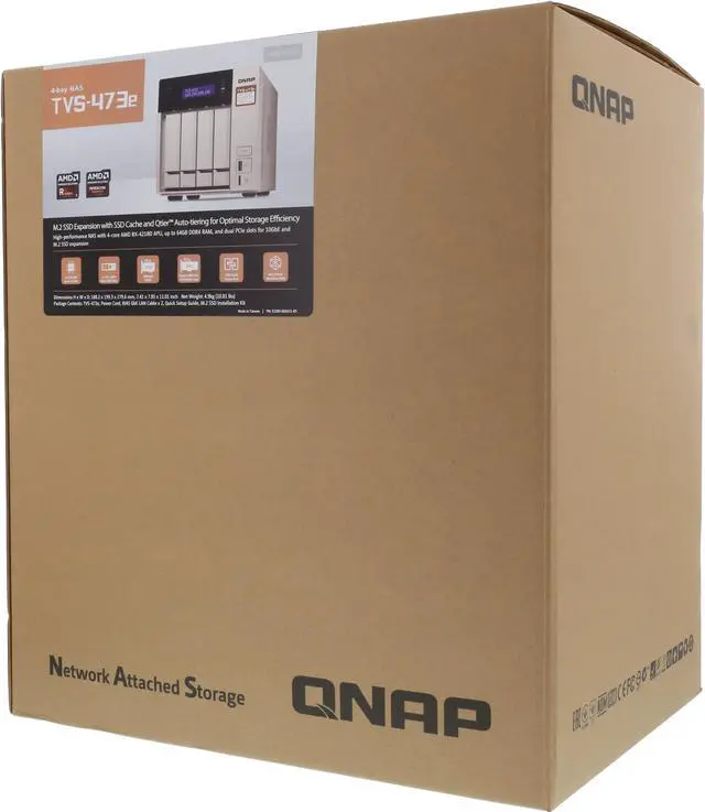 TVS-473e 2 x Ethernet Cable 1 x Power Cord 2 x Flat head screw (for M.2 SSD) 12 x Flat head screw (for 2.5" HDD) Quick Installation Guide (QIG) 2 x M.2 SSD Heatsink
