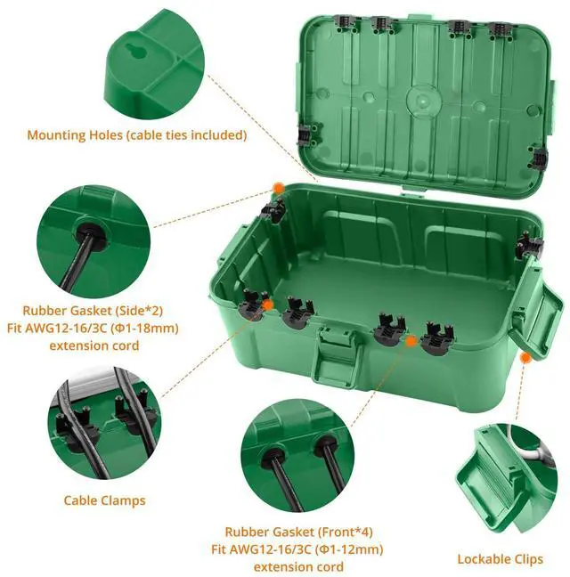 Wide Compatibility: Never worry about your outdoor connections again! This protective box delivers total security against the elements. Its combination of 4 locking clips, a full lid, and sealing rubber gaskets ensures an waterproof seal for various cords, including 12/14/16 gauge, braided, and flat types.