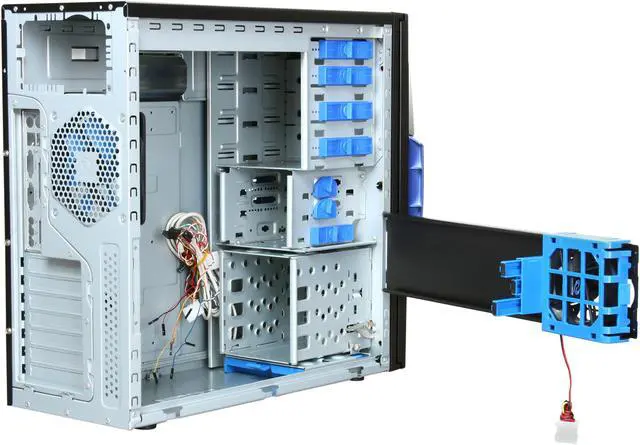 System setup is eased by having the mobo tray attached to the right side panel. Undo the locking screws and remove the side panels and you have a totally open chassis. Install the mobo and expansion cards to the side panel along with the CPU and memory then all you have to do is put it back in place as a unit. But first install all your drives in the tool-less racks. When both sections are assembled all you have to do is connect the wiring.