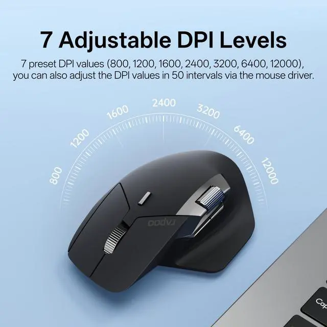 7 preset DPI values (800/1200/1600/2400/3200/6400/12000), adjustable in 50 intervals via the mouse driver to balance precision and quickness.