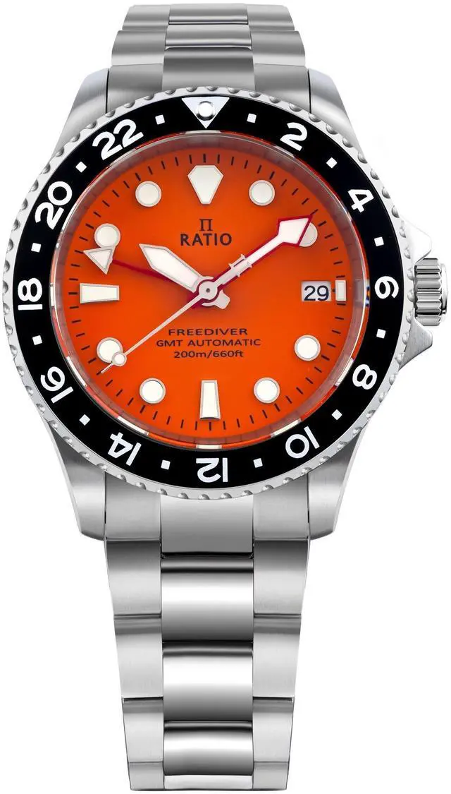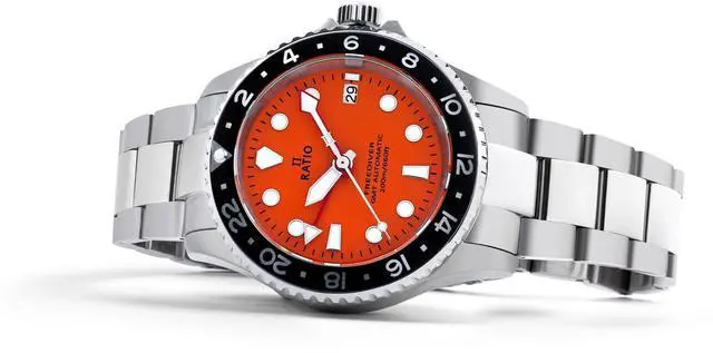 Featuring a striking orange dial and a black bezel with aluminum inlay, this GMT watch is crowned with a sapphire crystal enhanced with an anti-reflective coating. The unidirectional bezel, marked with clear 24-hour indicators, showcases the Ratio logo at the 12 o'clock position and a date window at 3 o'clock.