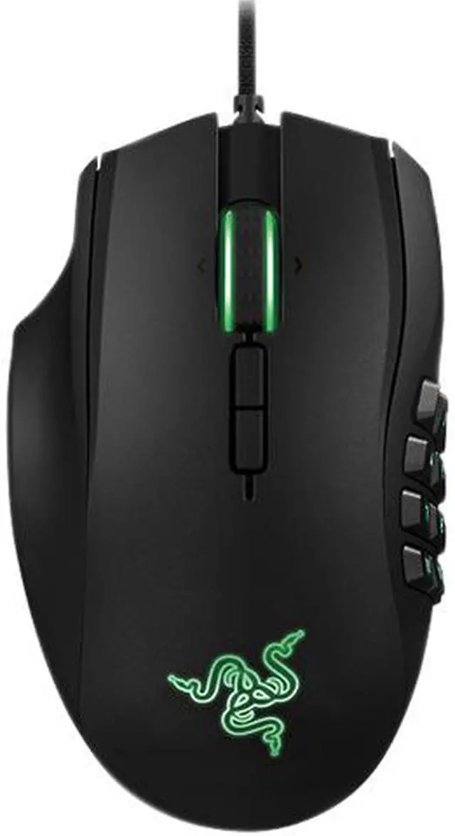 | Features | Total of 19 MMO optimized programmable buttons 12 button mechanical thumb grid Tilt click scroll wheel 8200dpi 4G laser sensor Razer Synapse 2.0 enabled Green LED backlighting 1000Hz Ultrapolling Up to 200 inches per second /50g acceleration Zero-acoustic Ultraslick mouse feet 7 foot/2.1m braided fibre cable |