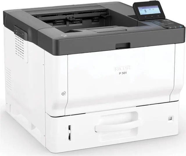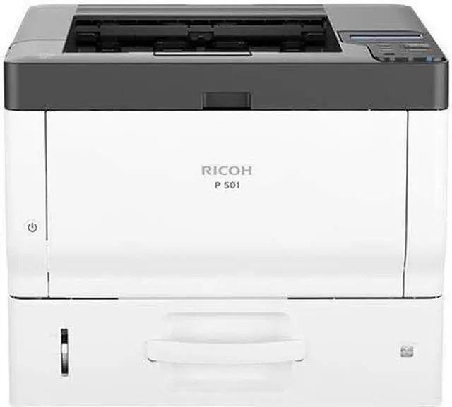 Get fast printing and energy-efficient operation with the P 501 Monochrome Printer from Ricoh. The printer features a 500-sheet input tray, which accepts media up to 8.5 x 14", and a 100-sheet bypass tray accommodates special paper stocks, envelopes, labels, and more. Print resolution is an impressive 1200 x 1200 dpi for sharp text on documents, and the unit has a fast print speed of 45 ppm. A four-line LCD lets you check the status of your print jobs, and the unit is compatible with Ricoh's Web Image Monitor, which lets you check system status, change settings, and expedite maintenance from your desktop.