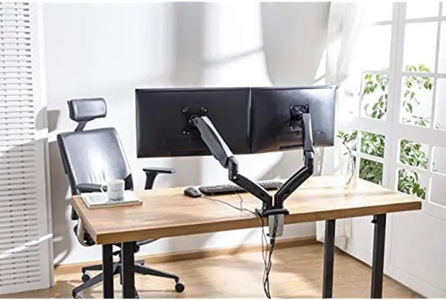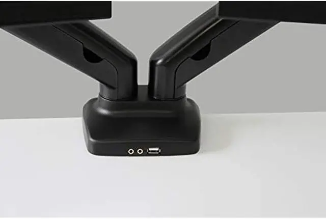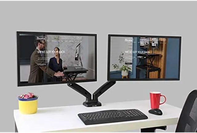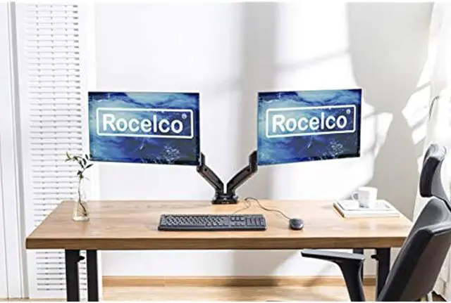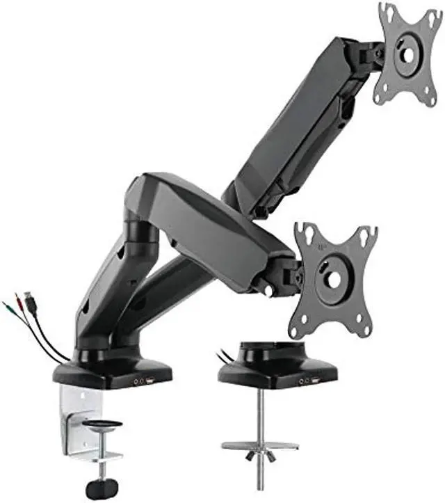 Rocelco Premium Height Adjustable Double Monitor Arm - Pneumatic Motion Assist Desk Mount - Fits 13" - 27" LCD-LED Dual Screens up to 14.3 lbs - Universal VESA Computer Stand (R MA2), Black Monitor arms will support two 13” - 27" Screens up to 14.3 lbs. Accomodates 75 mm x 75 mm and 100 mm x 100 mm mounting patterns. ^^ USB 2.0 and multimedia ports offer convenient way to connect and charge your devices. ^^ Swiveling design at screens (180 degrees), center (360 degrees), and base (360 degrees). ^^ Cable channels help you maintain tidy, clutter-free workspace.