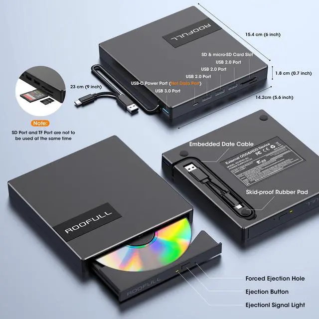 ROOFULL ?RF40-SU External CD/DVD Drive with USB Hub & SD Slot for Windows and Mac Laptop PC