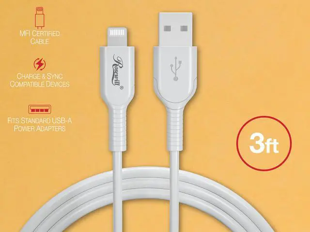 Connect your iPhone and Apple devices with MFi certified Rosewill RCCC-21001 USB-A to Lightning Cable for transferring photos and files or recharging from laptop, USB charger or power bank when on the go. The 3 ft lightning cable supports up to 2.4A charging current/speed to compatible quick charge devices with a data transfer rate of up to 480Mbps for safe and stable connection. With certified design for connecting an Apple device with the lightning connector, iPhone, iPad, iPod, AirPods charging case and more, to a USB-A port, it is fully compatible with Apple power adapter and fits standard USB-A chargers.
