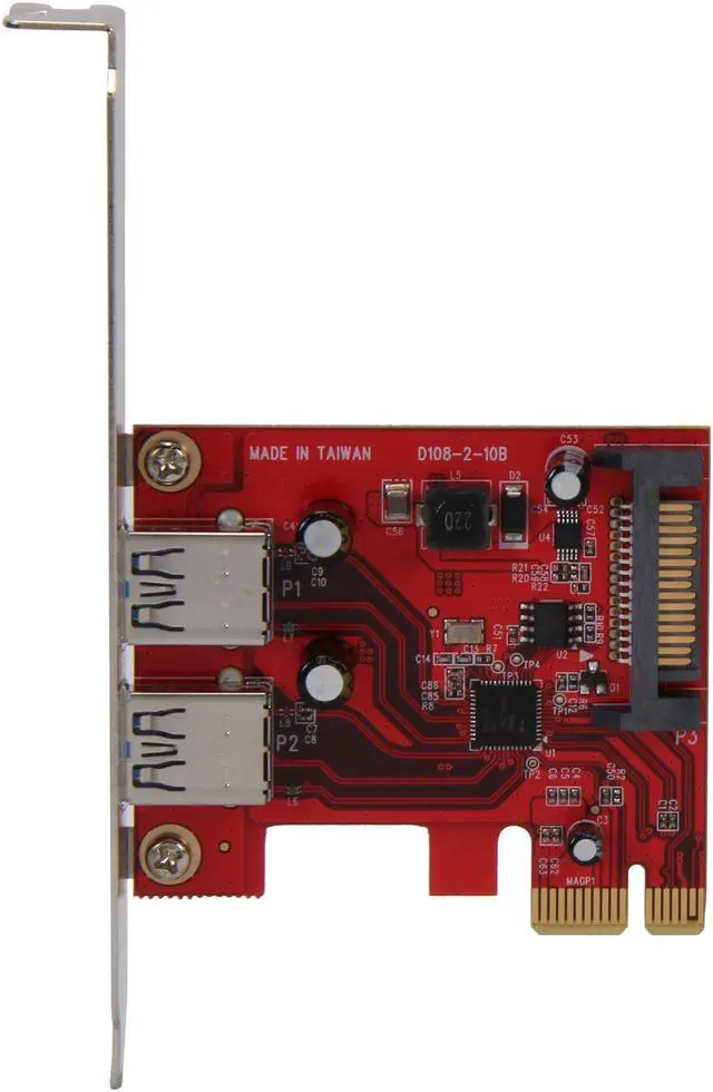 | Features | NEC Chipset Supports PCIe 1.0 and PCIe 2.0 motherboard Supports up to 2 external USB3.0 Devices - Optimized for external USB SSDs, hard drives, drive enclosures, and USB3.0 Flash Drives Supports Max 1.5A USB 5V bus power per USB 3.0 port Backwards compatible with USB 2.0 & 1.1 Compliant Intel eXtensible Host Controller Interface (xHCI) Specification 0.95 Hot-Swap and Hot-Plug Support Standard 4-pin Molex 8981 power connector or 15pin SATA power connector Supports 64bit and 32bit Windows 8, Windows 7, Vista, XP and 64bit 2008 R2, and Linux kernel 2.6.31 or later RoHS Compliant |