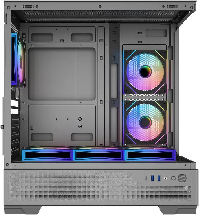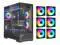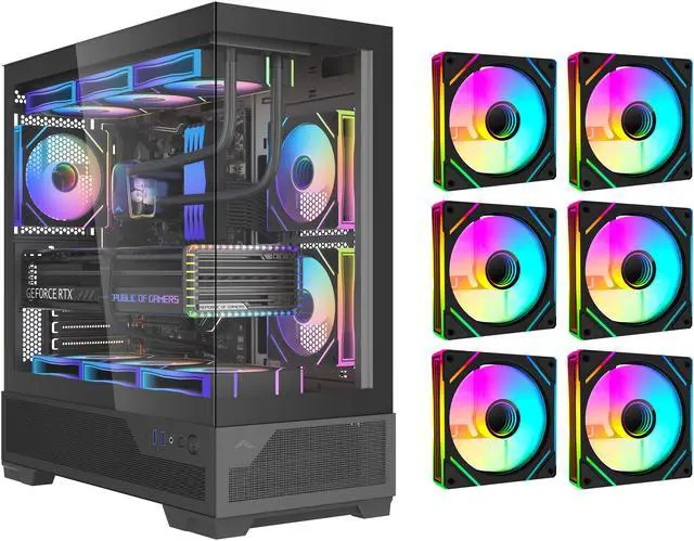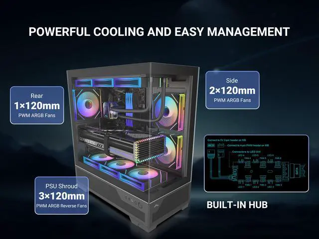 It features 6 pre-installed 120mm PWM ARGB fans and a built-in PWM+ARGB HUB, enabling precise control over fan speed and RGB lighting effects.