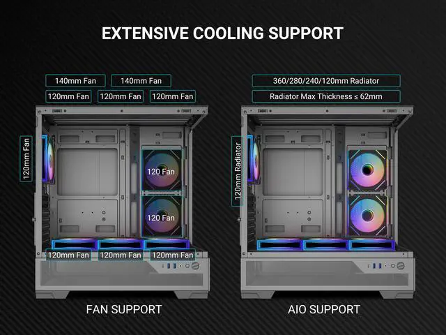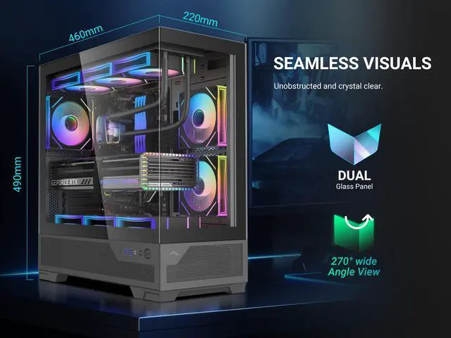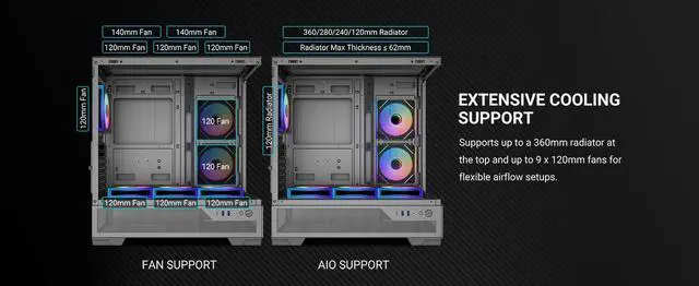 With 9 fan slots and top 360mm water cooling support, it delivers exceptional heat dissipation for overclocked CPUs and high-end GPUs.