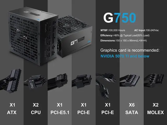 SAMA G750W ATX 3.1 Power Supply, 750W, Cybenetics Gold Standards, PCIe 5.1 Ready, Full Modular, Japanese Capacitors, FDB Fan, Black Version