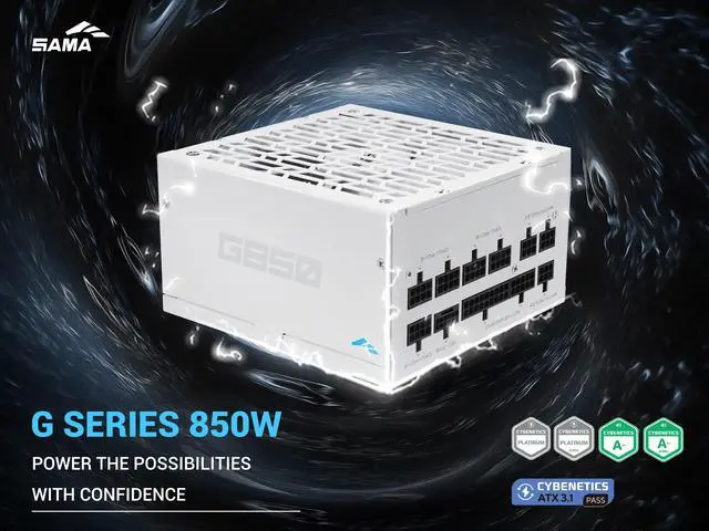 SAMA G850W ATX 3.1 Power Supply, 850W, Cybenetics Gold Standards, PCIe 5.1 Ready, Full Modular, Japanese Capacitors, FDB Fan, White Version